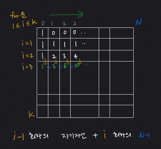 --> D[K][N] = D[K][N - 1] + D[K - 1][N]