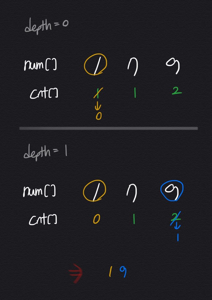 조합을 num[0] ~ num[2], 즉 1 7 9 의 범위에서 선택 하게 된다.