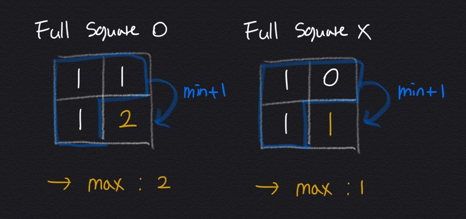 2 * 2 정사각형의 우측 하단 마지막 칸의 값을, 나머지 3칸의 최소값 + 1로 갱신해준다.