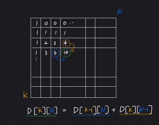 D[K][N] = D[K - 1][N] + D[K][N - 1]